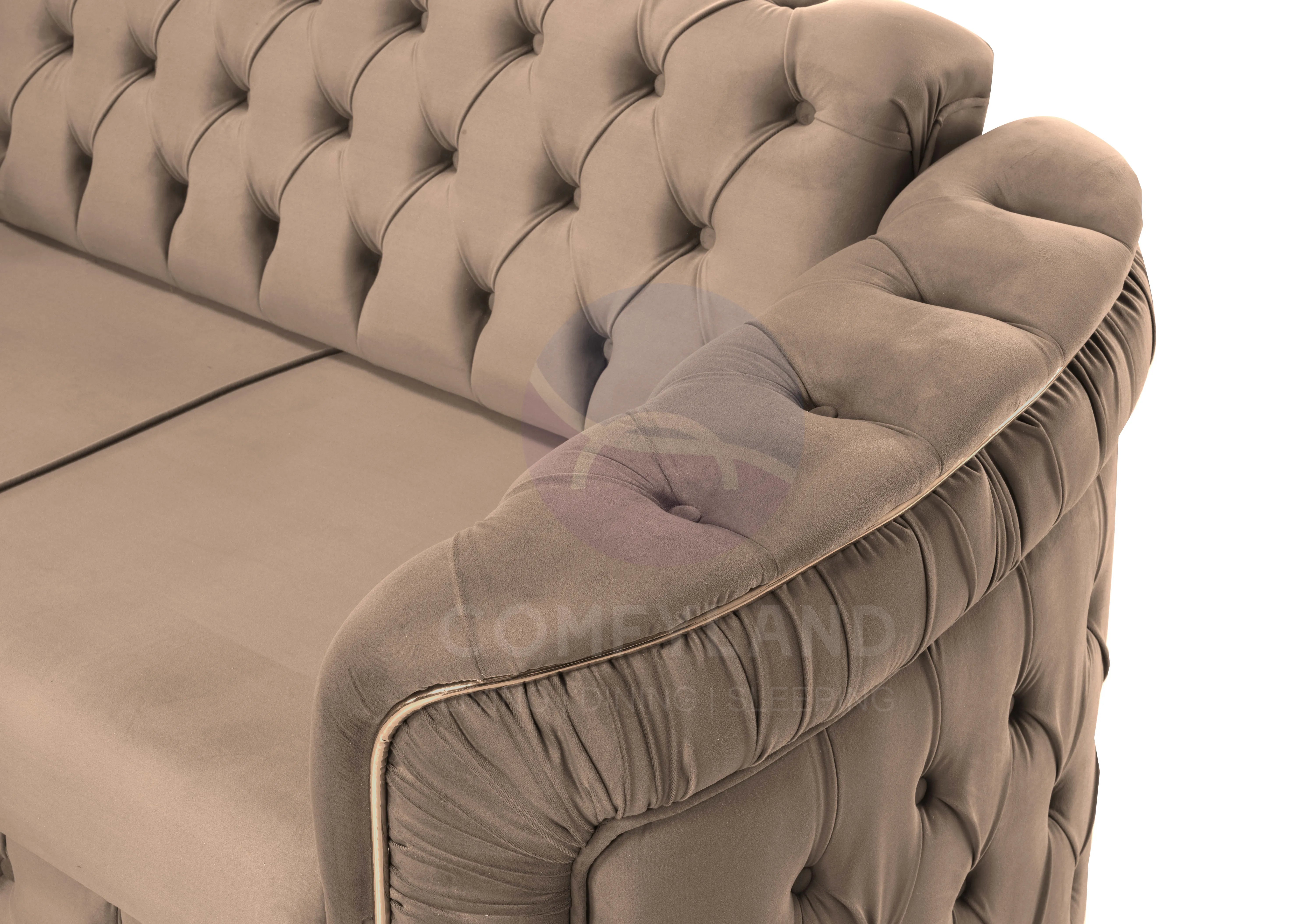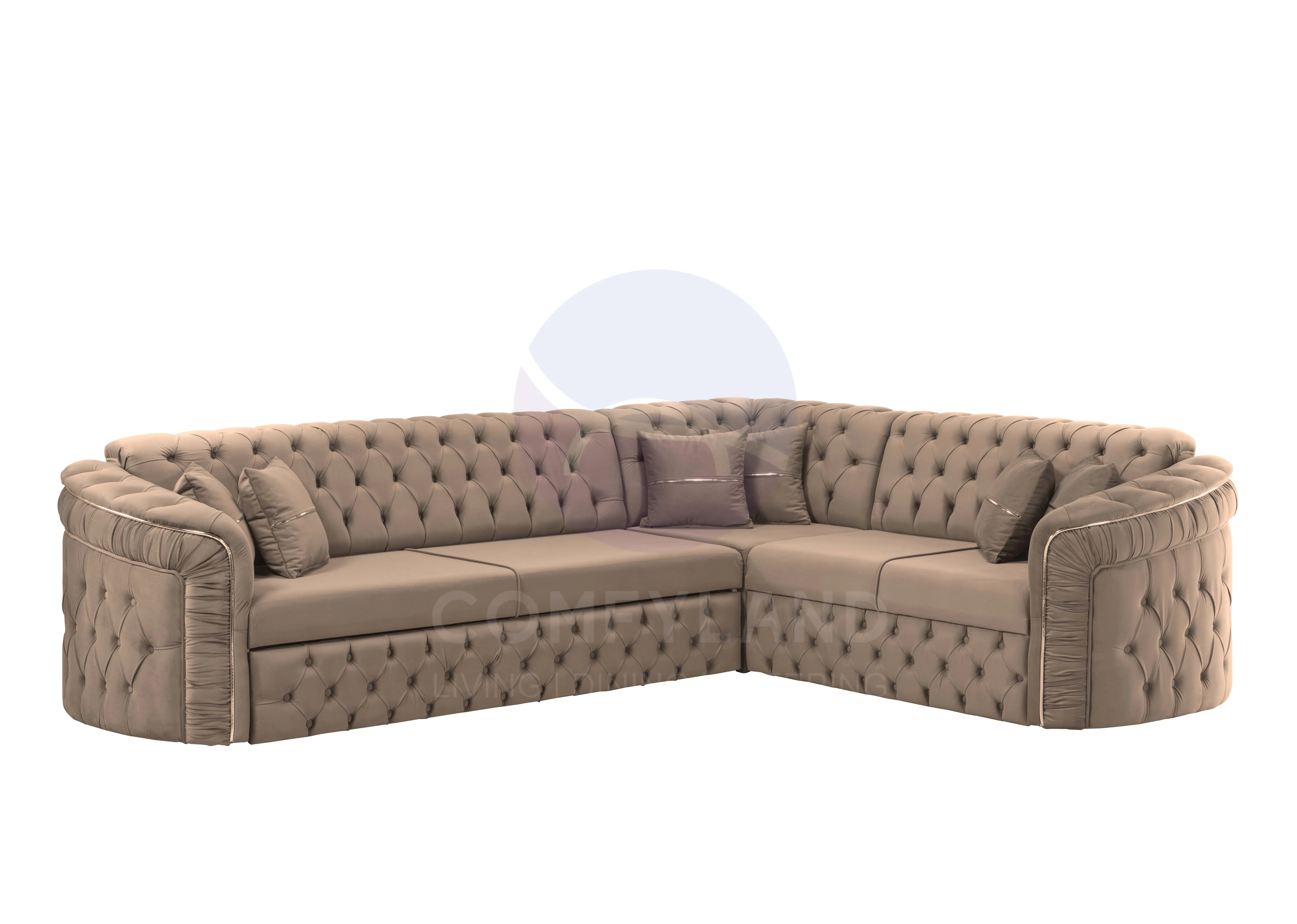 Upholstered in soft beige velvet and finished with refined button-tufted detailing, this comfy corner sofa bed adds a light, sophisticated touch to any interior. Its versatile functionality allows it to serve as a stylish seating solution during the day and a convenient sleeping space when needed.