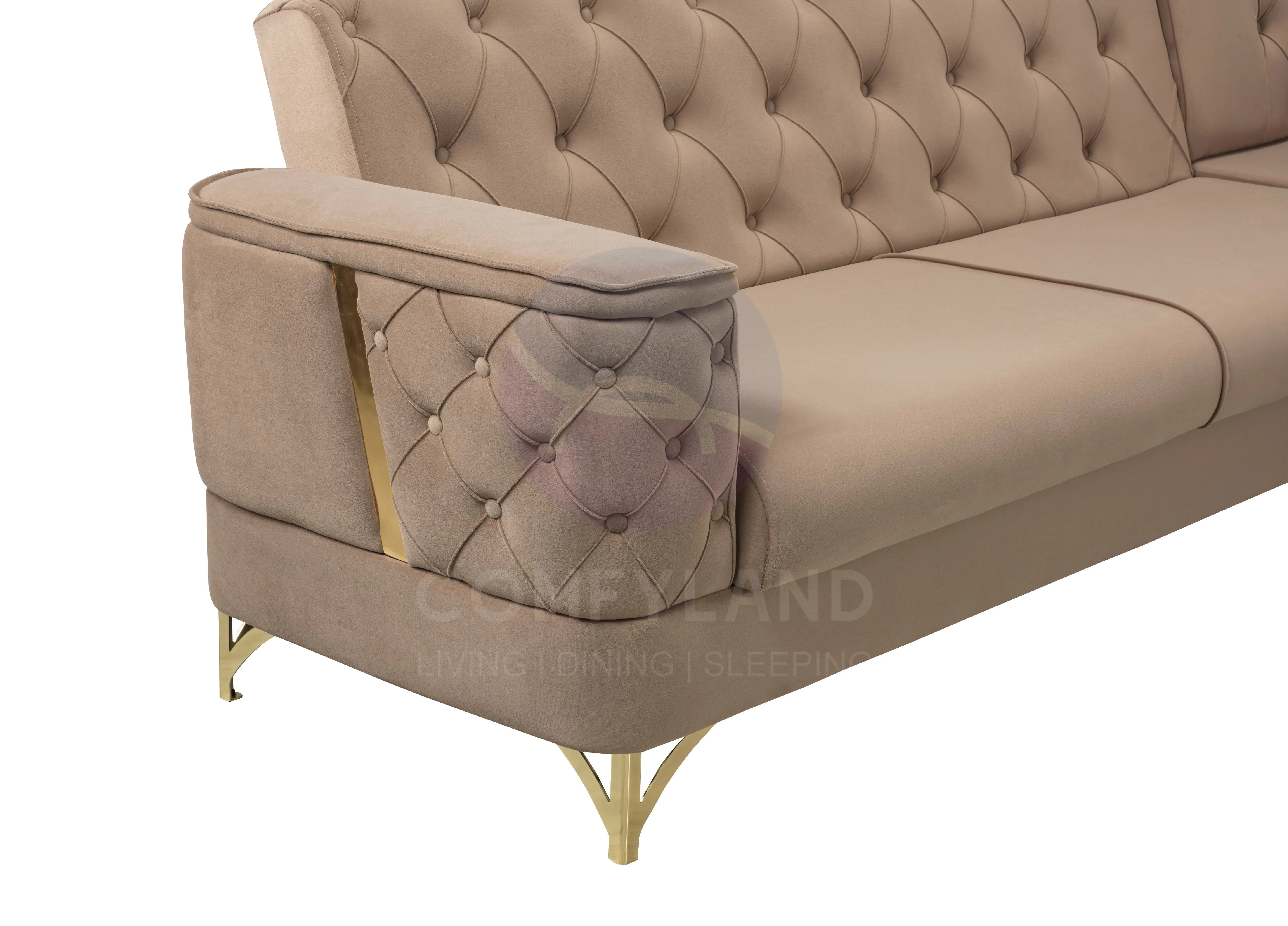 Finished in soft beige velvet with detailed button-tufting, this comfy corner sofa bed brings a warm and sophisticated touch to your living space. The integrated storage feature adds extra convenience, allowing you to keep essentials neatly tucked away while maintaining a clutter-free environment.