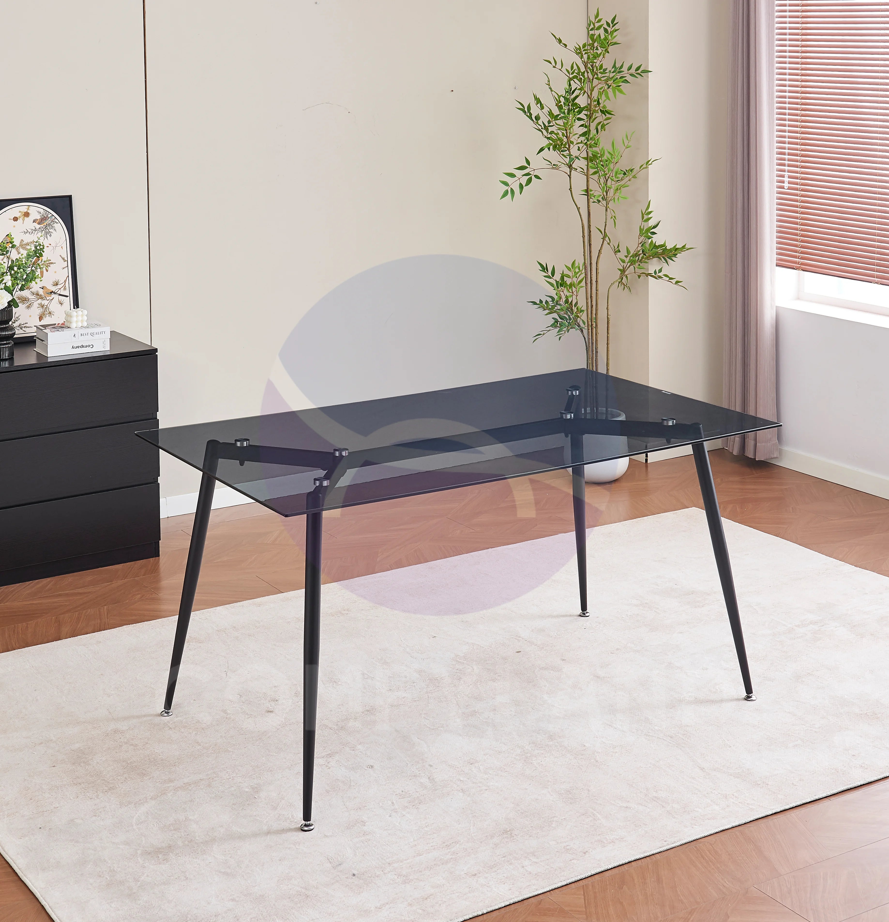The table includes a durable clear tempered glass surface, a strong black metal structure, a smooth and easy-to-clean finish, and a modern rectangular design suitable for kitchen and dining room settings.