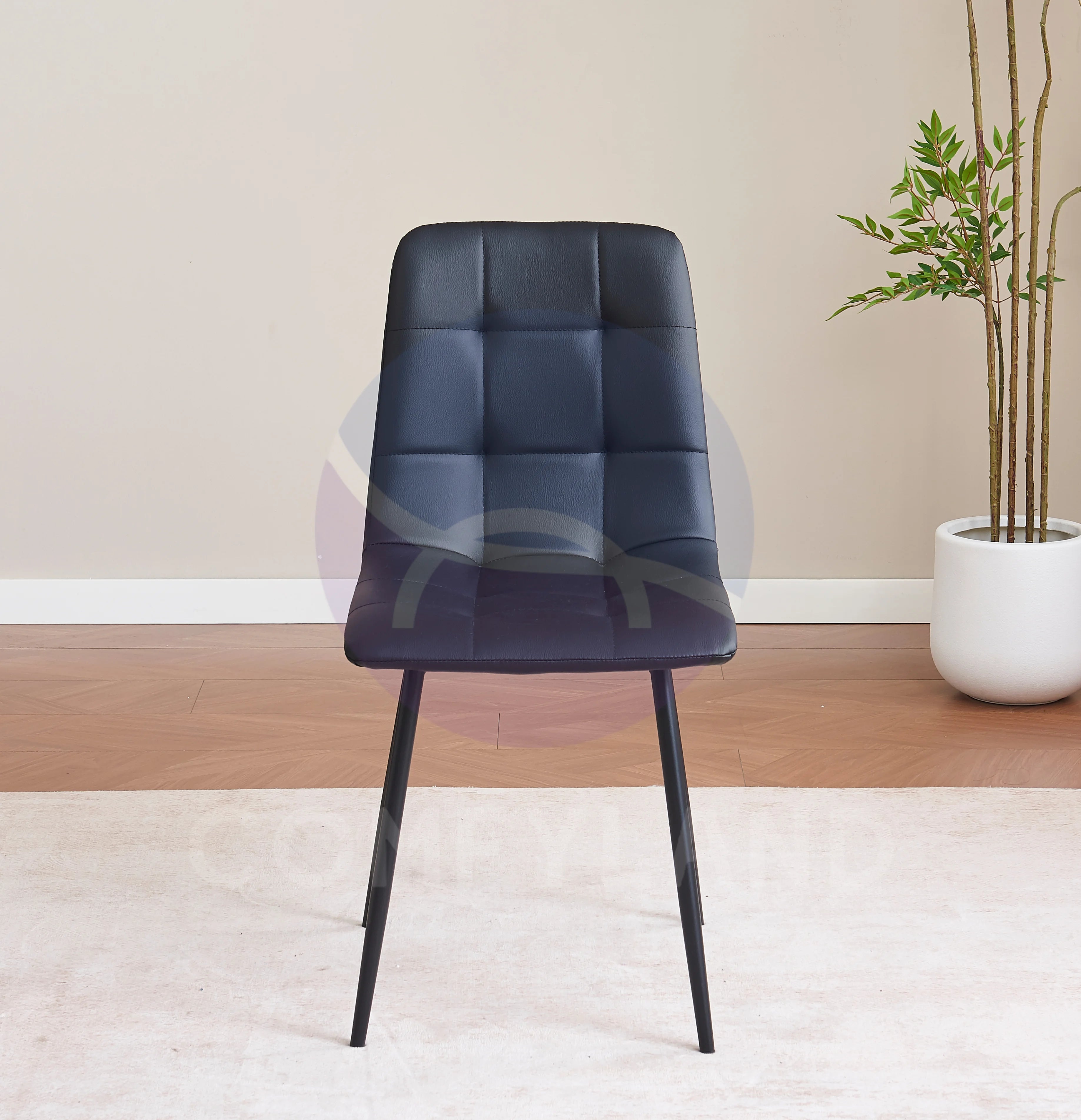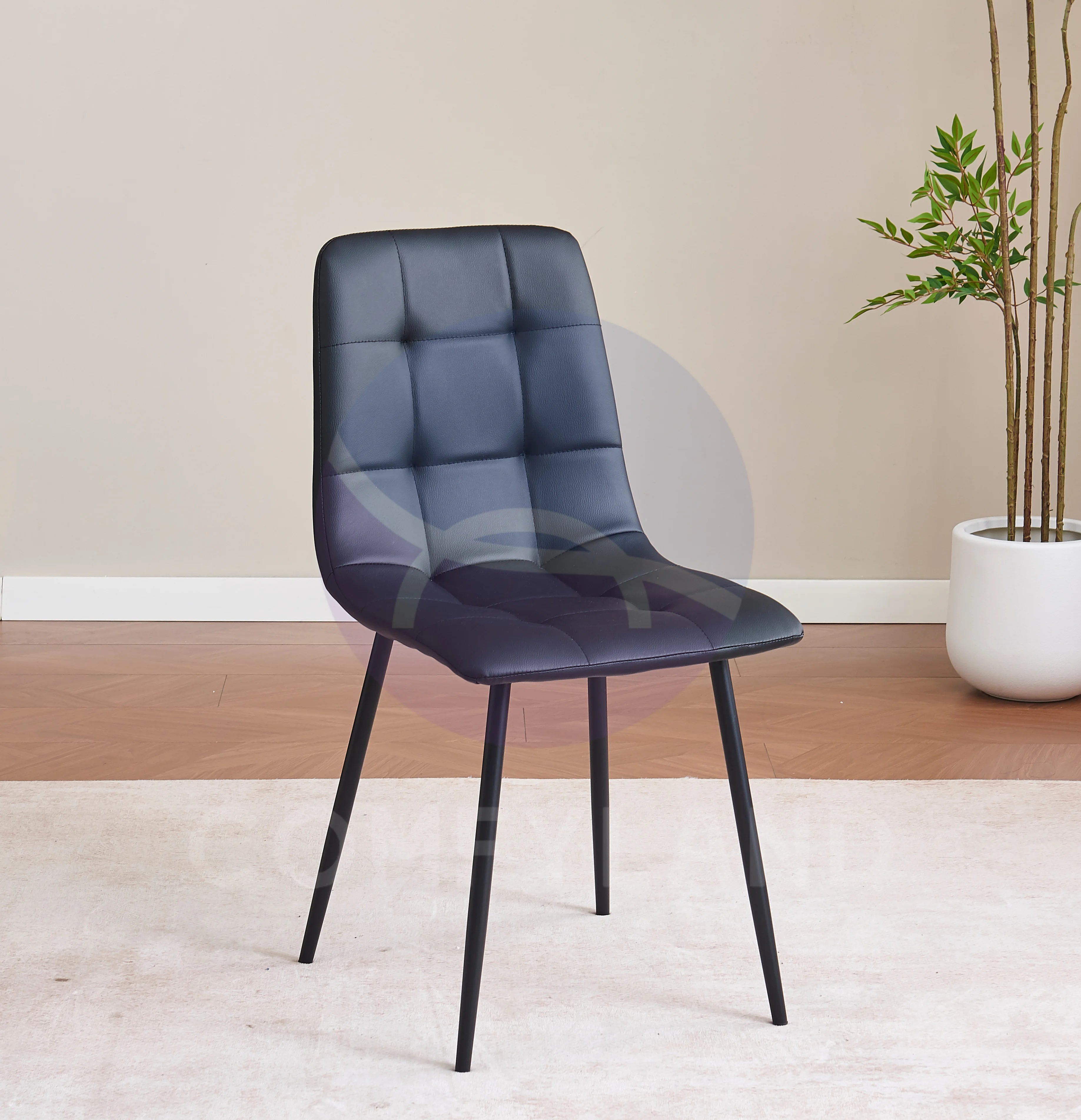 The chairs feature black faux leather upholstery, a cushioned seat, a tufted backrest for added support, and durable metal legs that ensure stability and strength.