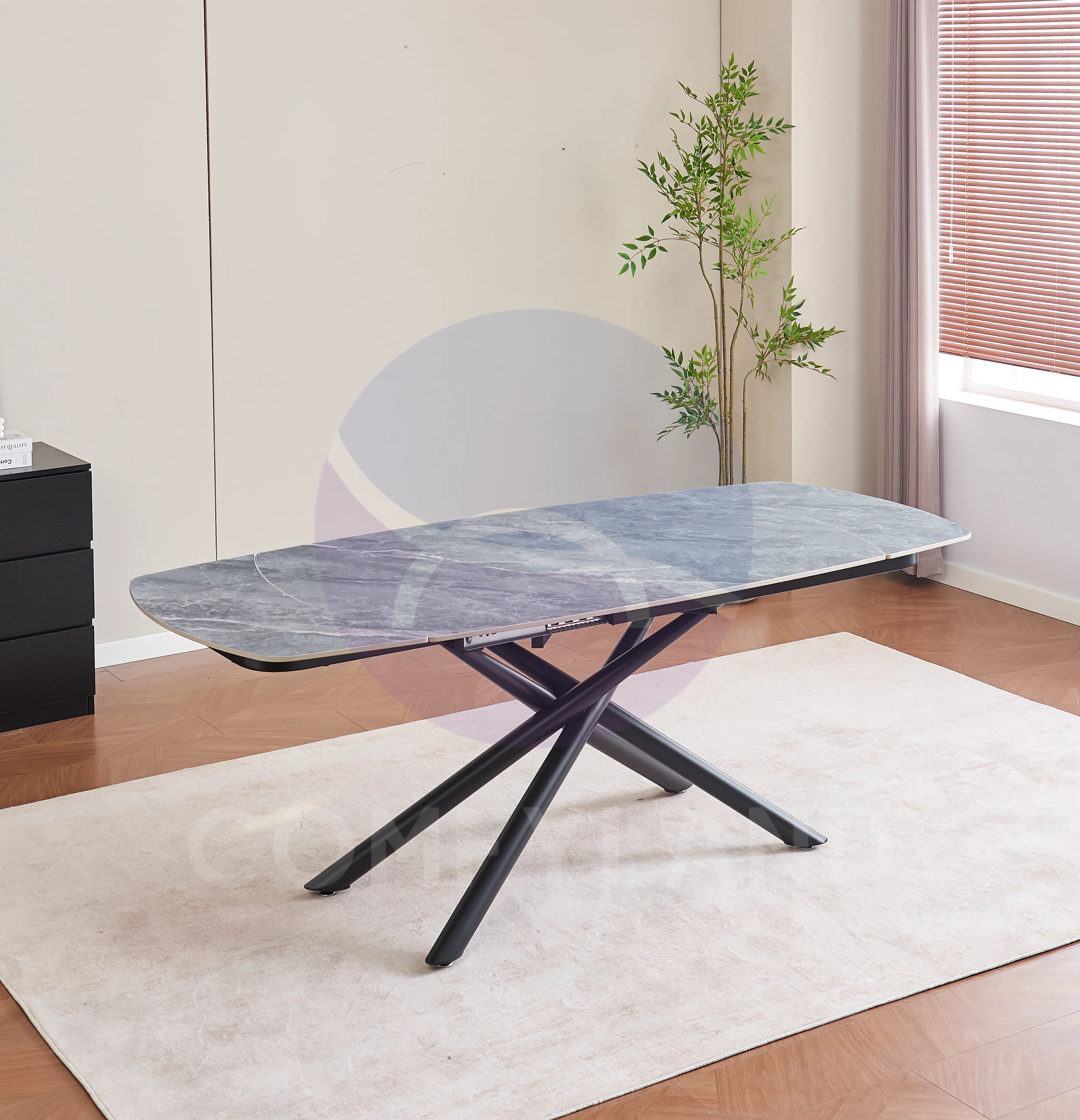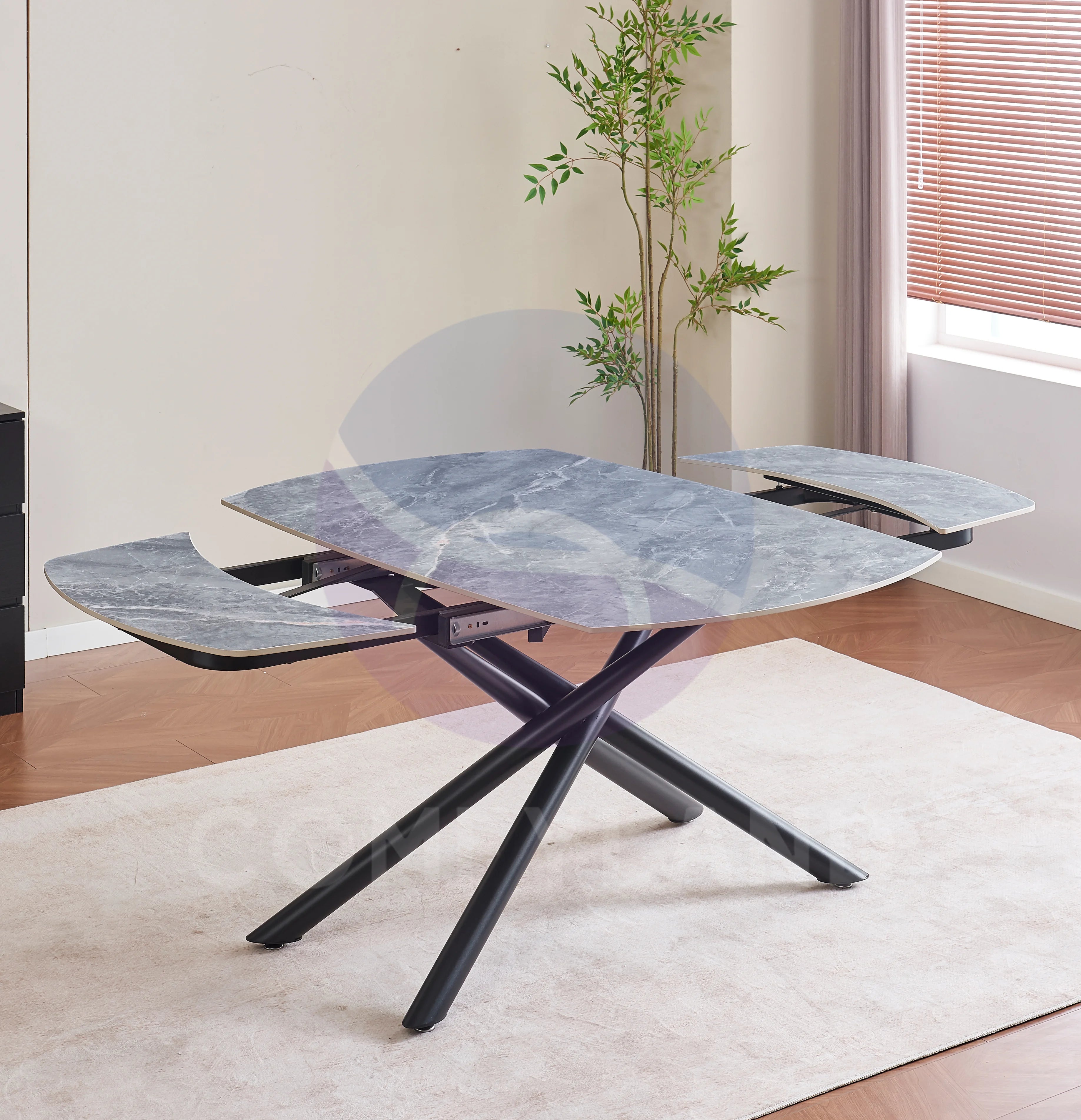 The dining table features a grey marble-effect tabletop with subtle veining, delivering a premium, high-end look that is easy to maintain. Gently rounded corners enhance visual softness and ensure everyday safety.