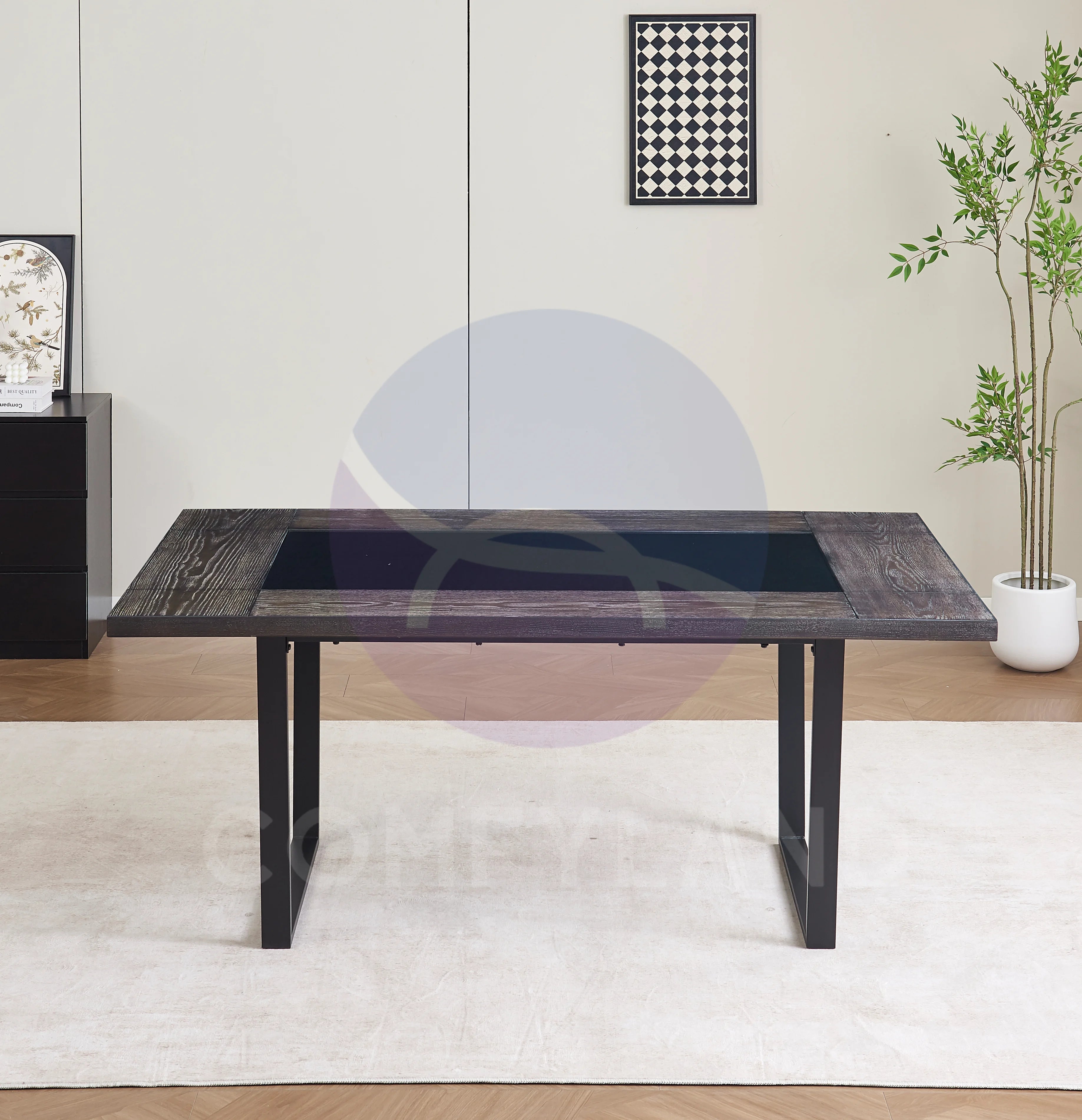 The dining table is crafted with a dark wood-effect tabletop featuring a sleek glass inlay at the center, adding a modern and sophisticated touch. The rectangular shape offers ample surface space for dining essentials, serving dishes, and decorative pieces. Supported by strong black metal legs, the table provides excellent stability, durability, and long-term performance, suitable for regular use.