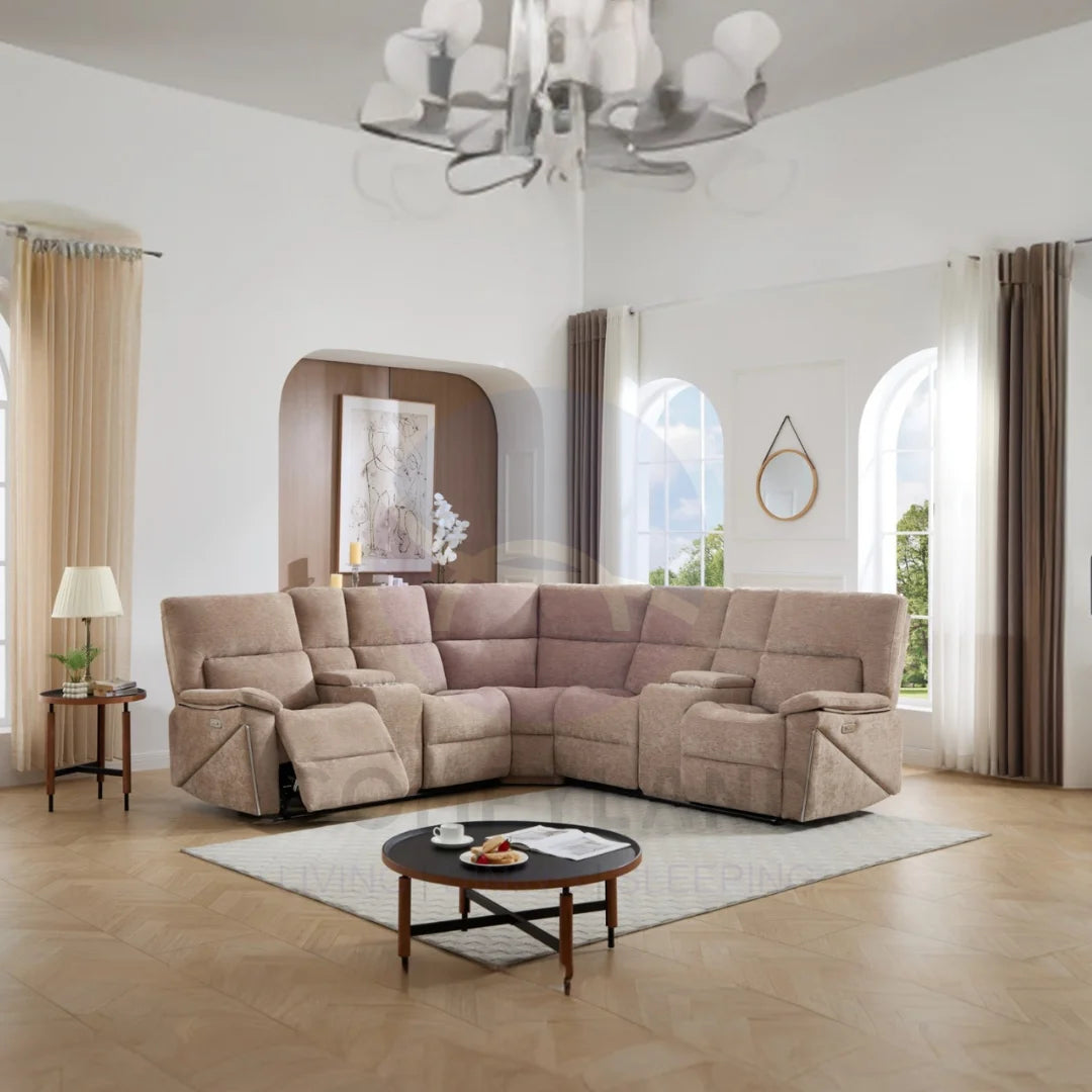 Premiere Beige Fabric Sectional Recliner Sofa with Dual Cup Holders